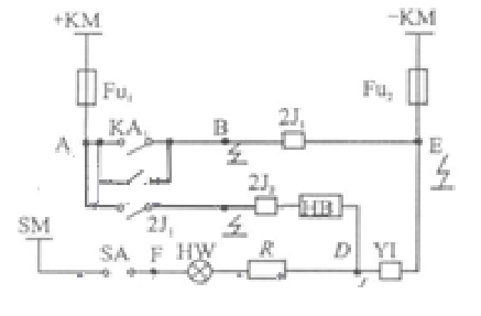 如圖1所示,當(dāng)圖中的A點(diǎn)和B點(diǎn)同時(shí)接地,相當(dāng)于A、B兩點(diǎn)通過大地相連接起來,中間繼電器2J1動(dòng)作生成斷路器的跳閘。同理,當(dāng)圖中的A點(diǎn)和C點(diǎn)同時(shí)接地,或圖中的A點(diǎn)、D點(diǎn)同時(shí)接地均可能生成斷路器的跳閘。